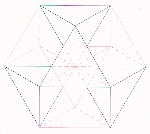 The four pointed pyramid is fire. The �four-star affair� is tetrahedron. A tetrahedron has four vertex points (stars, closest packing of spheres), six vectors (edges, relationships), and four faces (openings). This form is the basic building block of all the Platonic solids. It is the most minimal thinkable set that would subdivide universe. It encloses the least volume with the most surface area. The tetrahedron is comprised of four unique planes nonparallel to one another, thus four unique perpendicular poles to establish a four dimensional system.