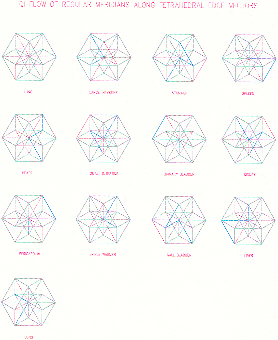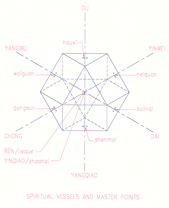 The 8 tetrahedra alone support the structure of VE while simultaneously defining the 6 half-octahedra. Similarly, the spiritual meridians support the qi body by serving as reservoirs for the regular meridians. Also since the spiritual meridians follow no specific energy flow, they have been associated with the tetrahedron, since the tetrahedra apexes share VE�s centroid. This quality reconfirms the close relationship of the spiritual meridians with yuan qi, found in the lower dan tian. VE is comprised of four unique planes of tetrahedra nonparallel to one another, thus four unique perpendicular poles to establish a four dimensional system. The four planes correlate to the four married pairs of the spiritual meridians; Du-Yangqiao, Ren-Yinqiao, Dai-Yangwei, Chong-Yinwei. Master points may be found at the center of area of each tetrahedron base, where each polar axis penetrates. Each polar axis of a tetrahedra married pair is a highway for yuan qi.